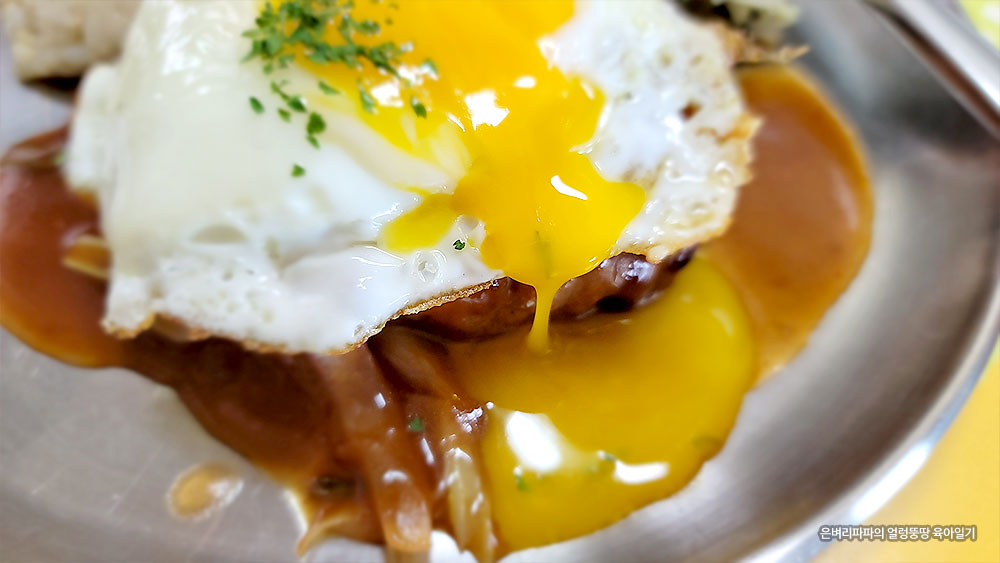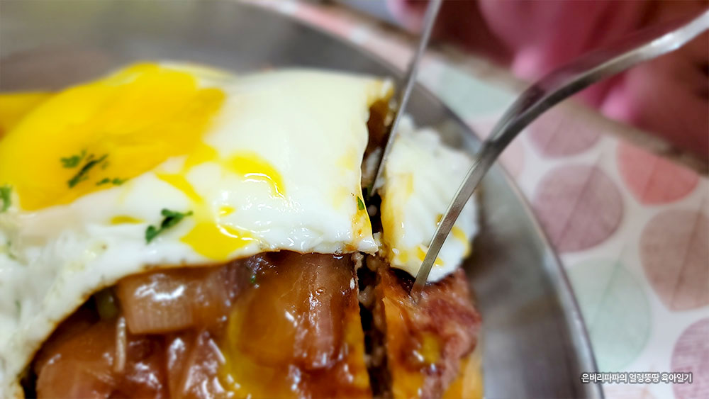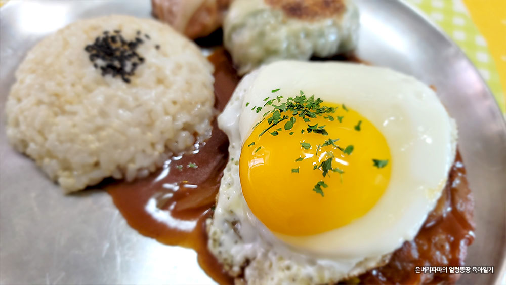 함박스테이크 위에 계란 프라이를 올리고,