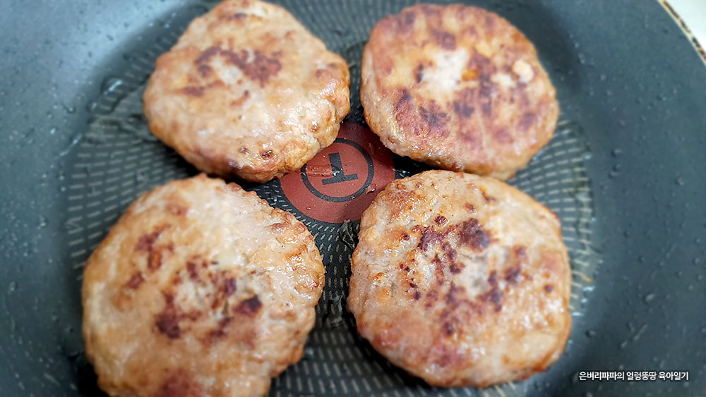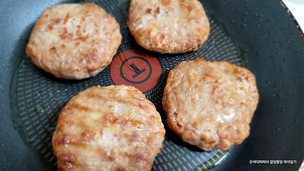 그래도 조금 해동되어 있는 냉동 함박스테이크를 올리브유를 두르고