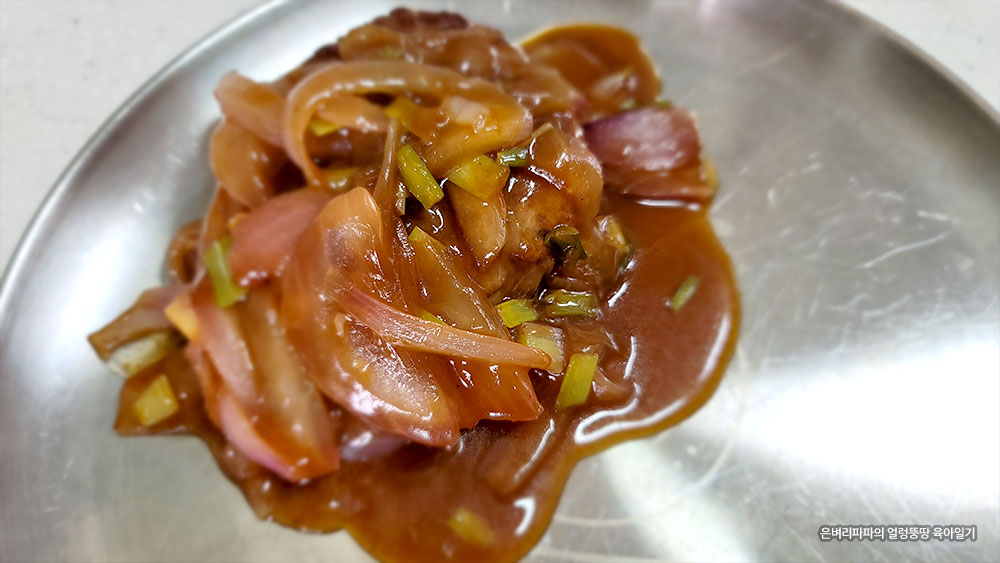 소스는 돈가스 소스를 기본으로 데리야끼 소스와 생수를 1:1:1로 넣어 줬습니다.