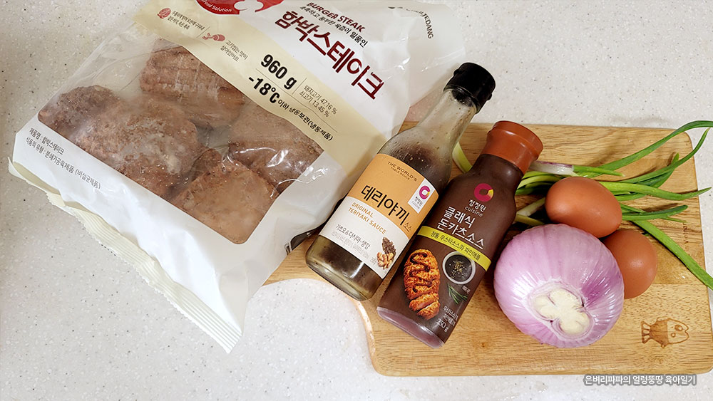 재료 : 냉동 함박스테이크, 양파, (쪽파), 계란