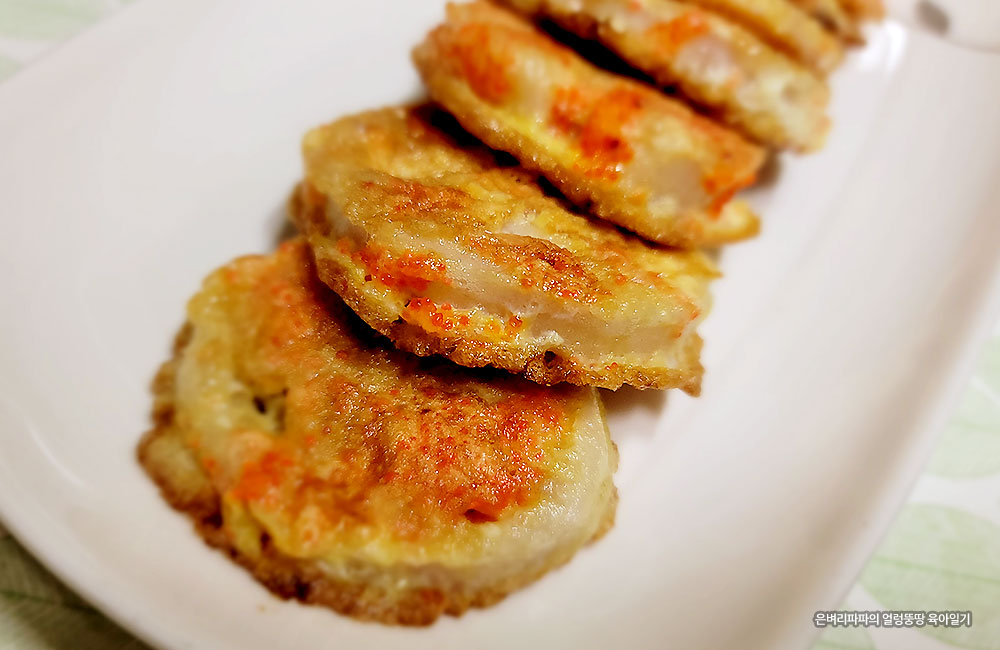 부침가루, 계란물 순으로 입혀 프라이팬에 노릇노릇 구워냅니다.