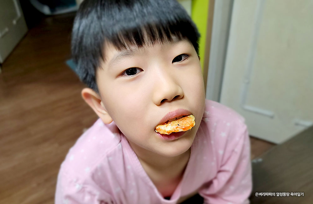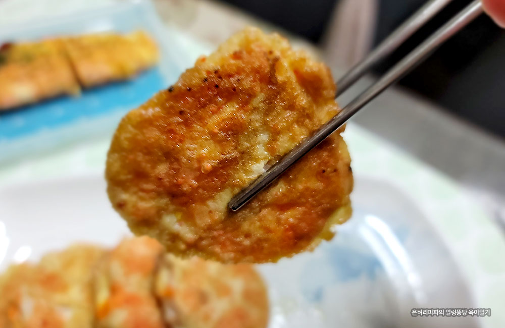 그렇게 갓 구워낸 날치알 연근전을 맛본 아들 녀석은 엄지손가락을 치켜세우네요.