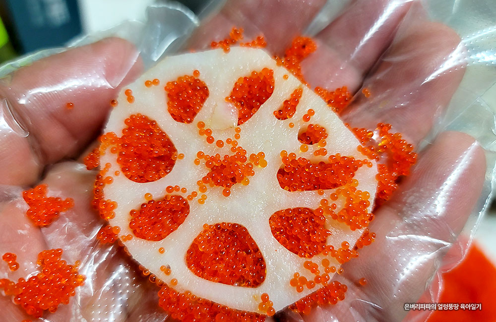 손바닥 위에 올려 연근의 구멍 사이로 날치알을 가득 채워줍니다.