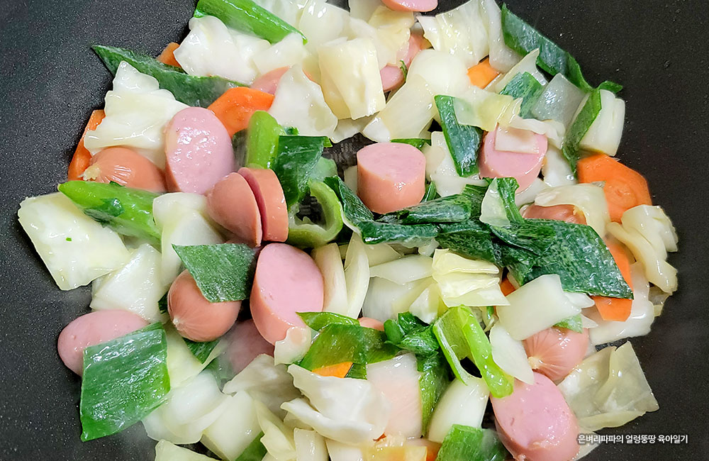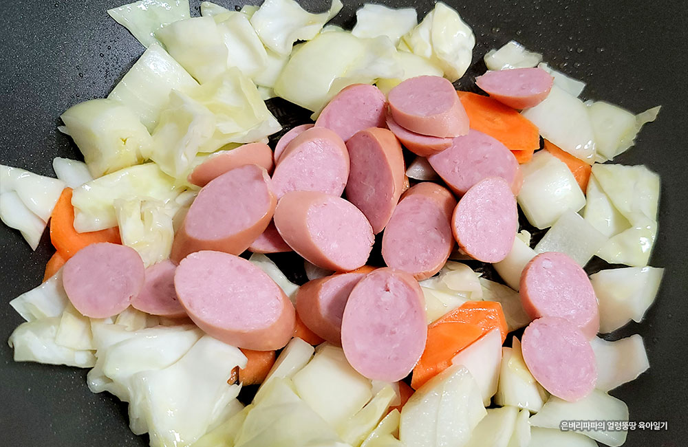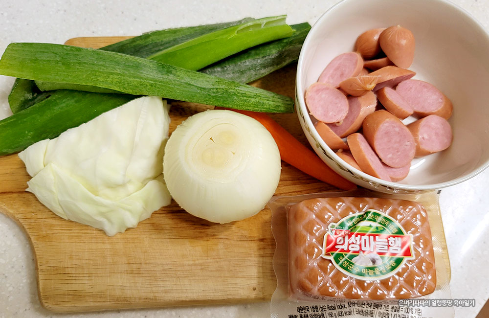 소시지를 기본으로 양파, 당근, 양배추, 대파를 준비했습니다.