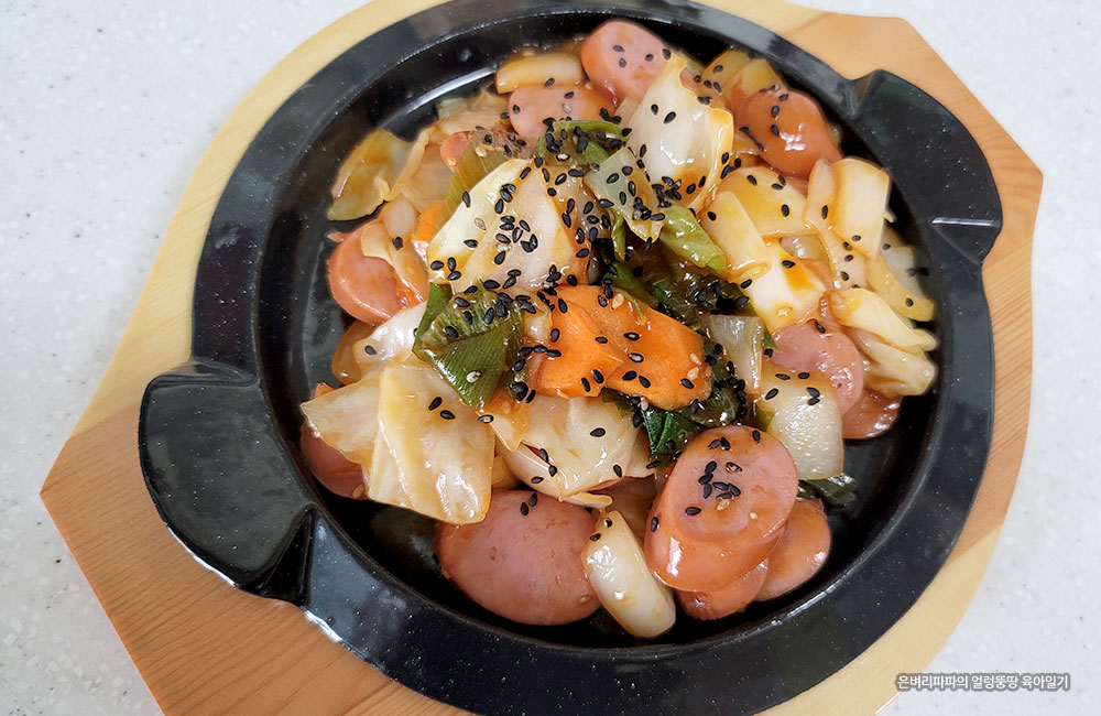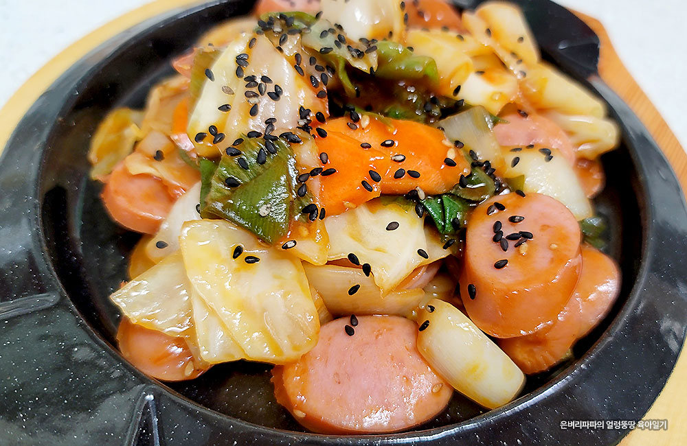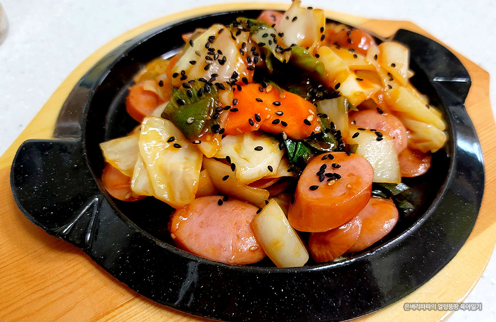 식탁에 올리기 전, 달궈진 무쇠 접시에 소시지 야채볶음을 담아내고