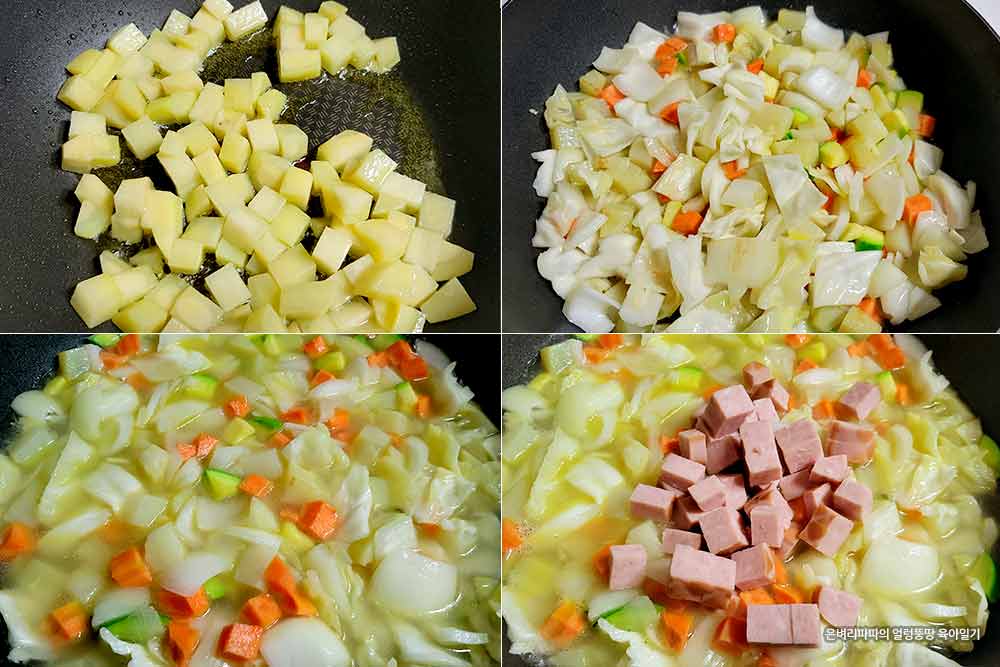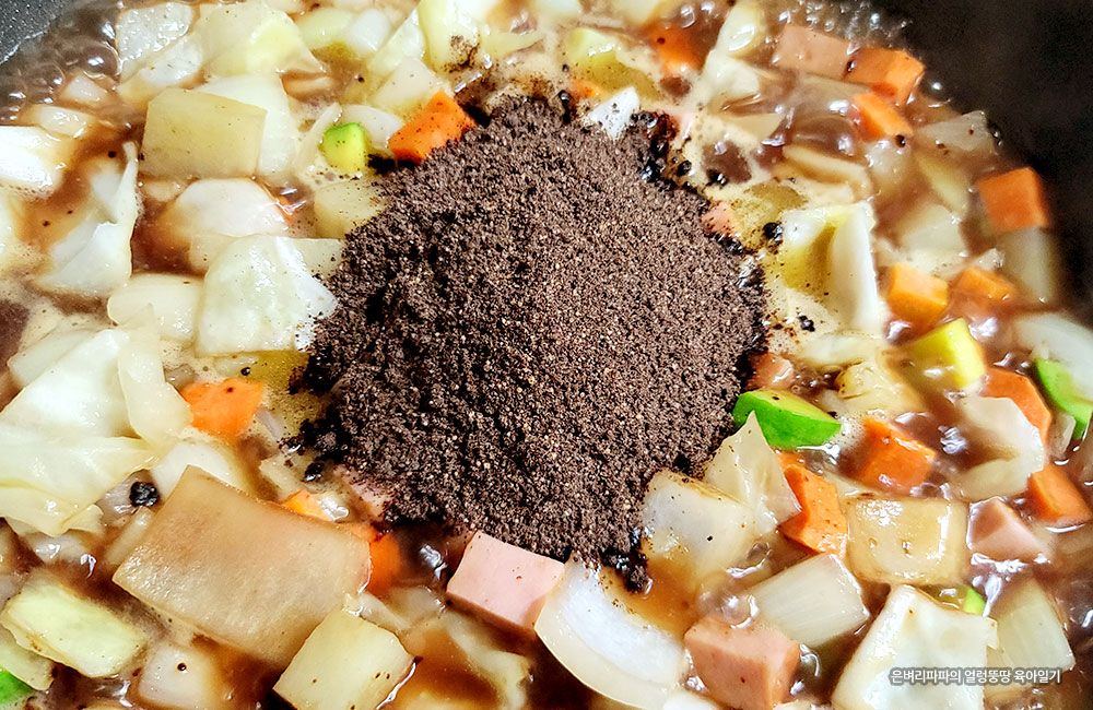 적당히 볶다가 물을 조금 붓고 채소가 익을 만큼 끓여 주세요.