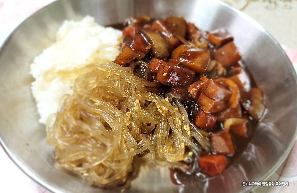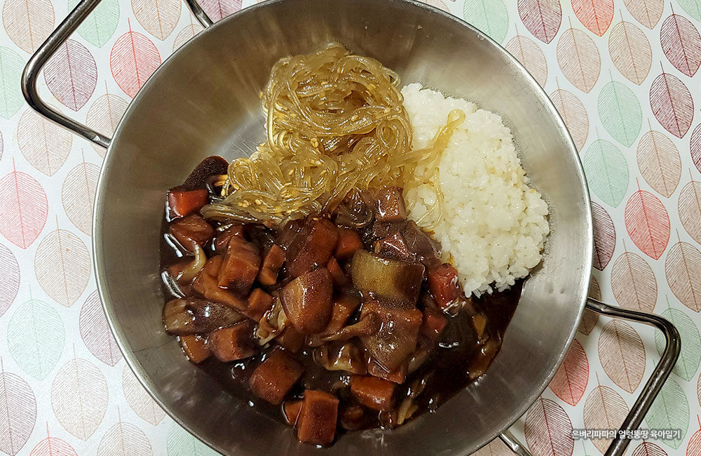 그릇에 밥과 당면을 적당량 담고, 짜장까지 올려주면 한 그릇 한 끼 요리 완성입니다.