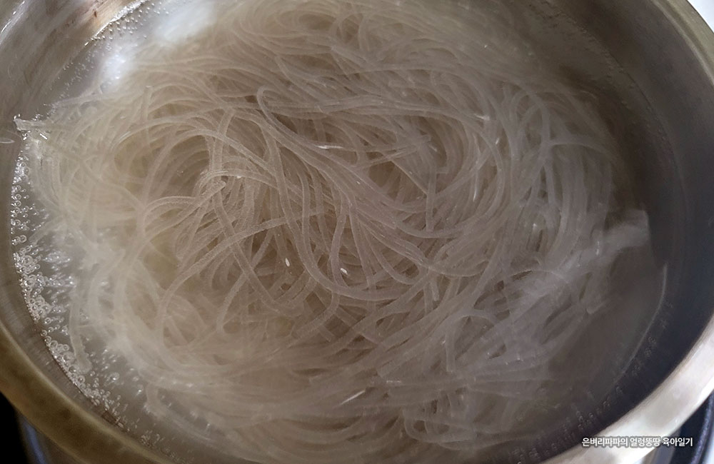 물에 불려 놓은 당면은 끓는 물에 삶아 냅니다.