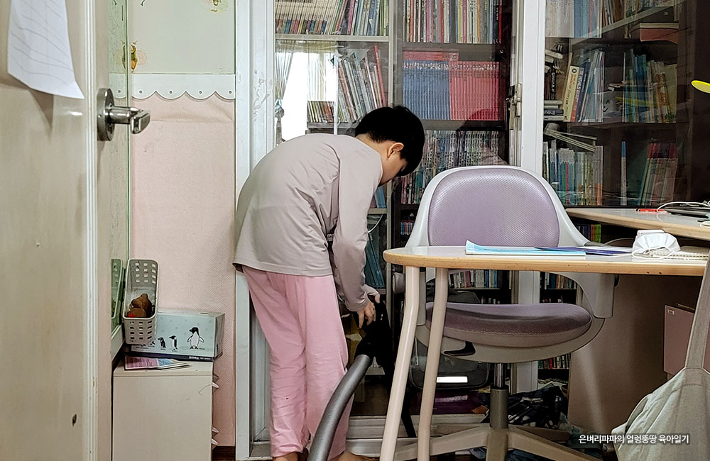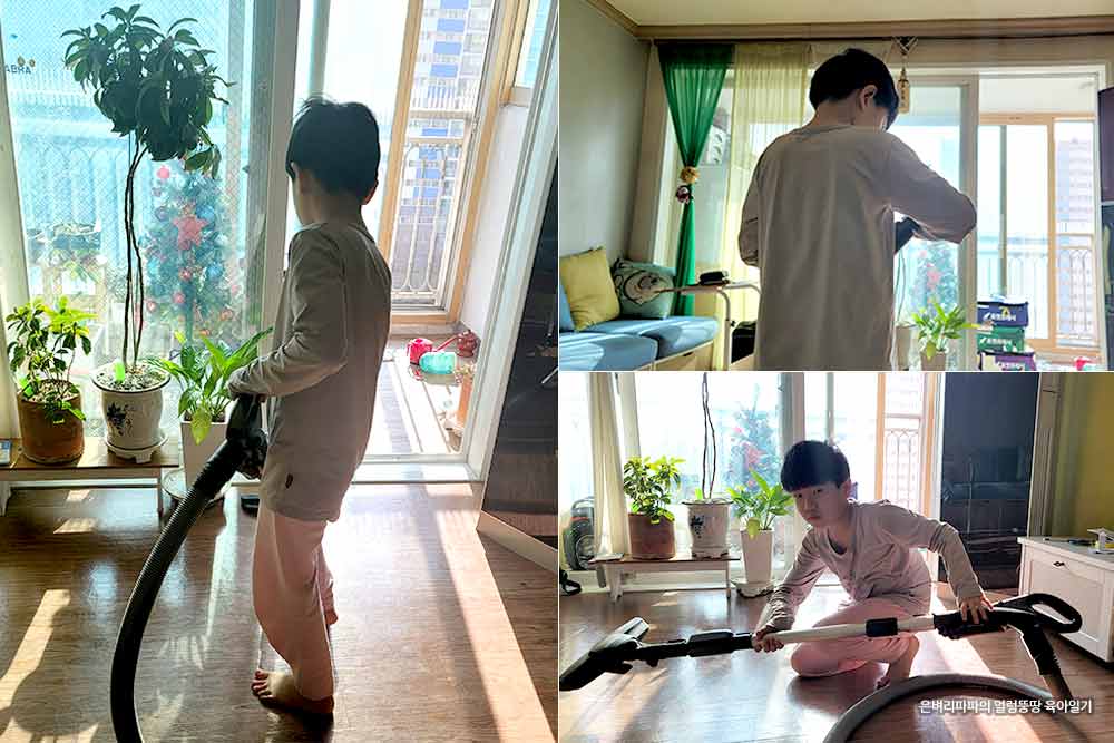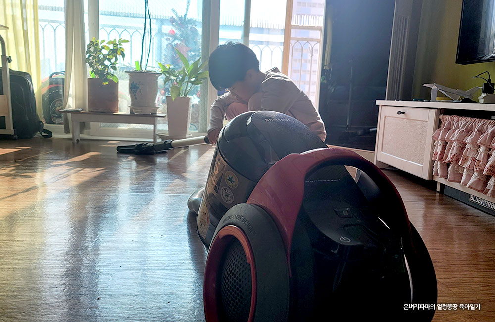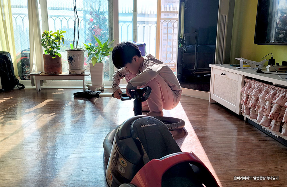 어느새 훌쩍 커서 청소기를 들고 거실부터 이방 저방 청소는 거뜬히 해내네요.