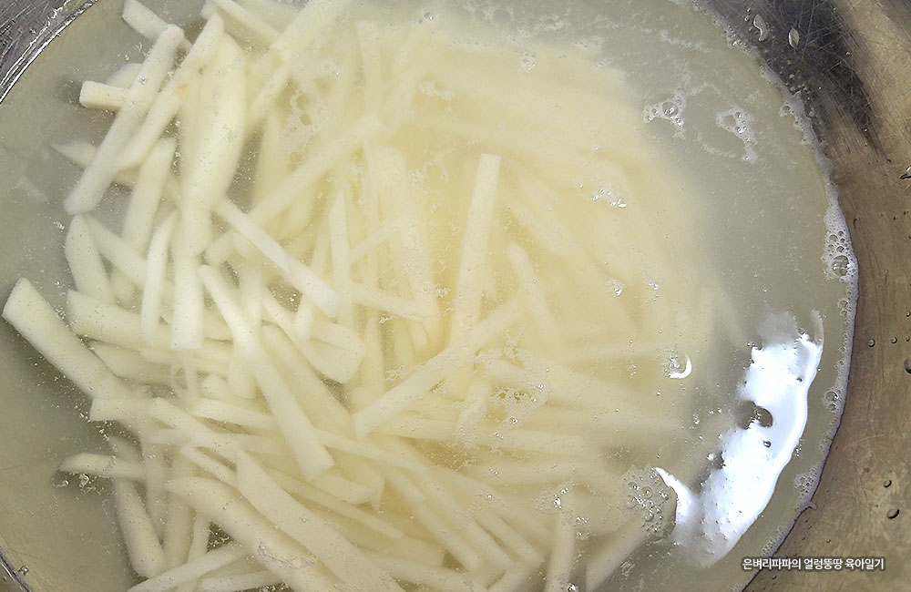 채 썬 감자는 찬물에 담가 전분기를 어느 정도 제거해 줍니다.