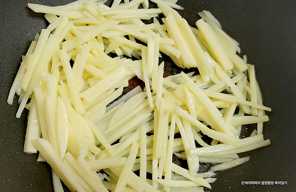 담궈 놓은 감자를 건져 물기를 제거하고, 먼저 넣고 볶아 줍니다.