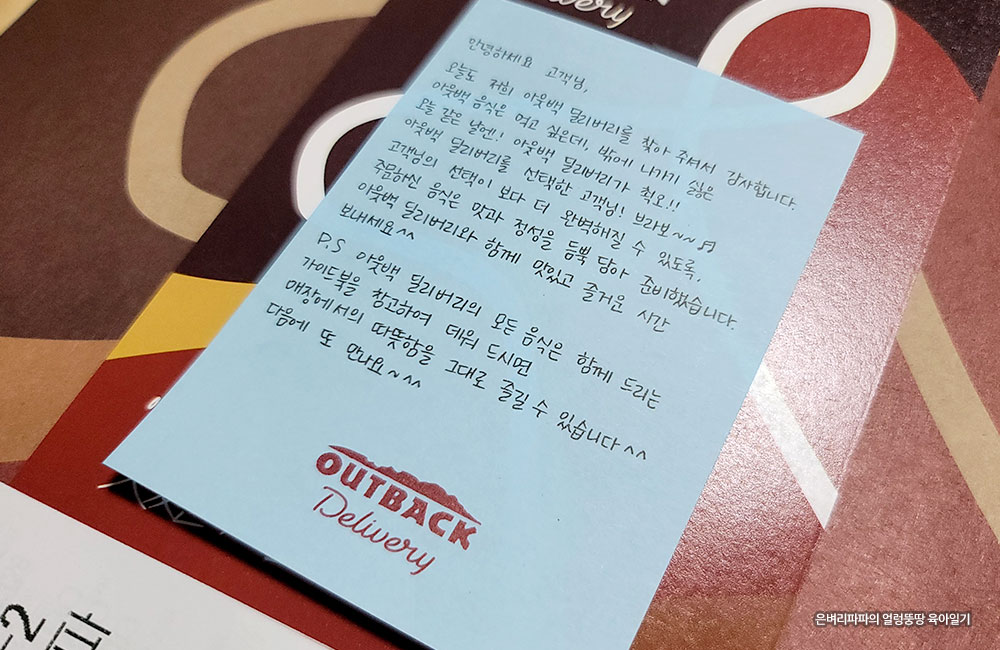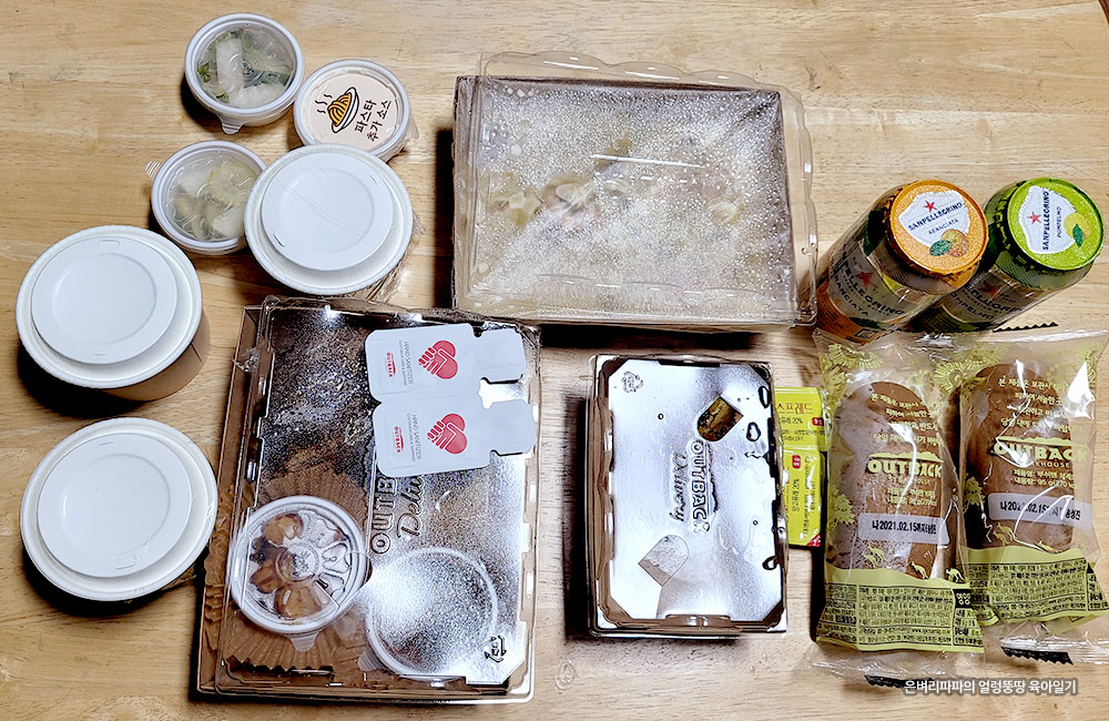배달어플로 주문한 조촐한 아들 녀석의 9살 생일 축하 파티 음식~ 아웃백 듀오 스테이크 세트~!