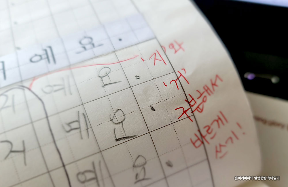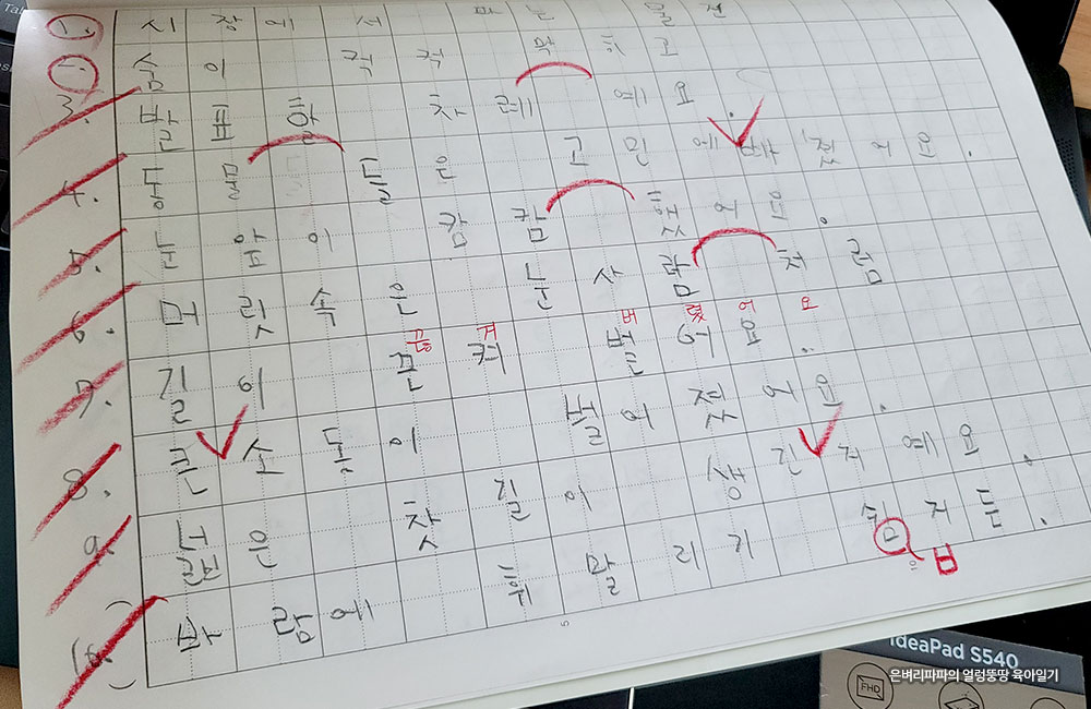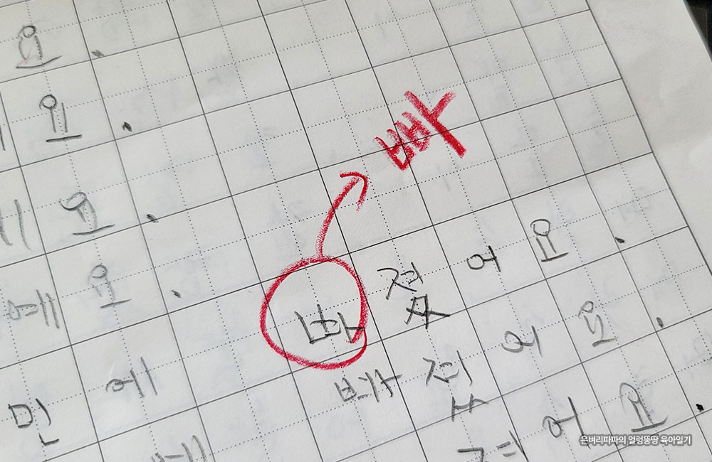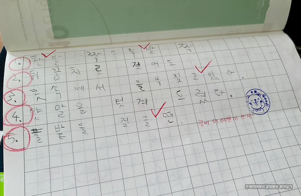 삐뚤삐뚤한 글씨는 더 예쁘게 쓰라며 체크를 해주시네요.
