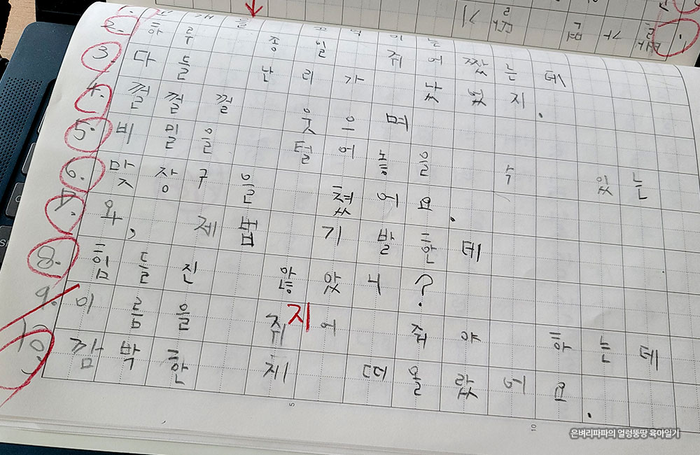 엄마가 장난 삼아 동일한 문장으로 받아쓰기 테스트를 해봤습니다.