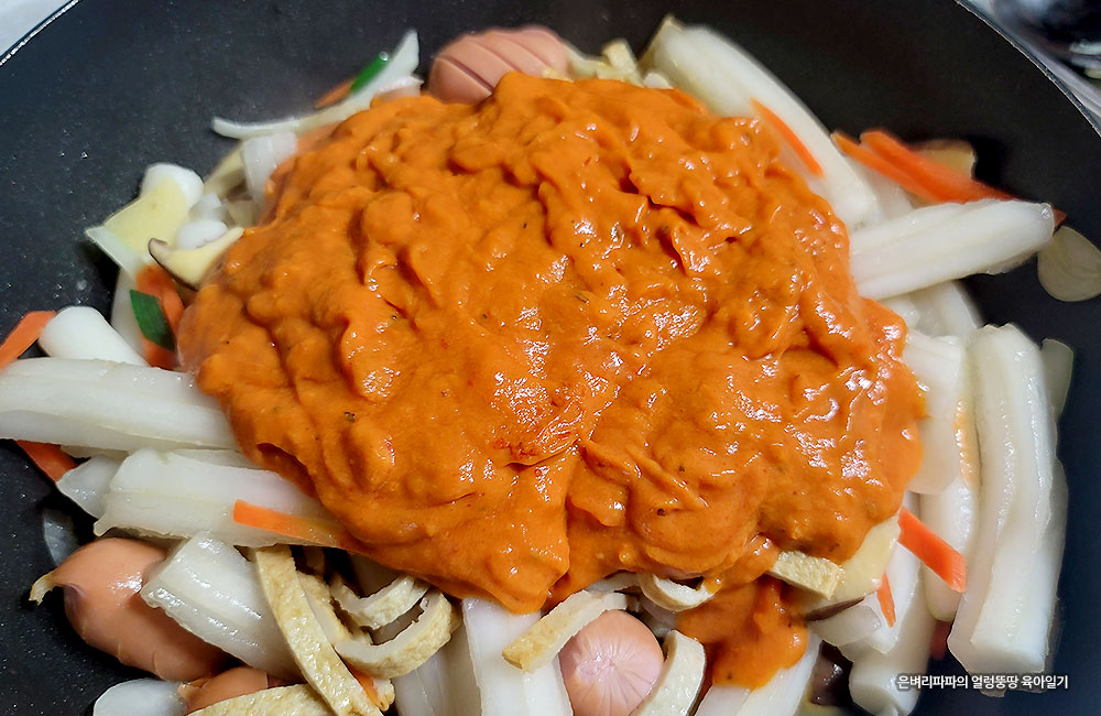 재료 : 로제 소스(토마토 생크림), 분모자, 떡볶이 떡, 어묵, 소시지, 가락국수 사리