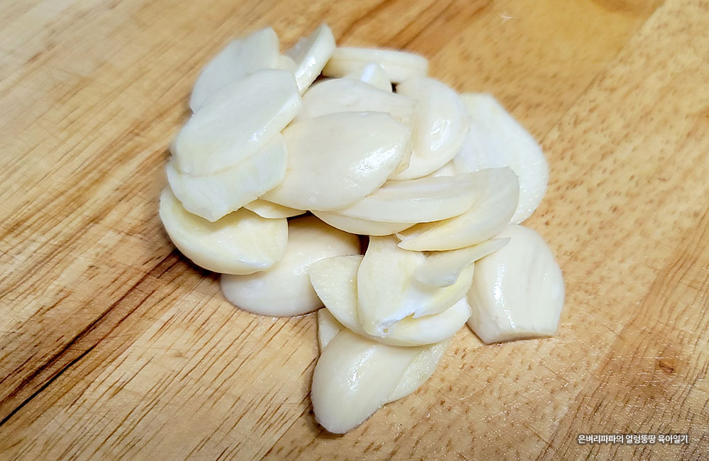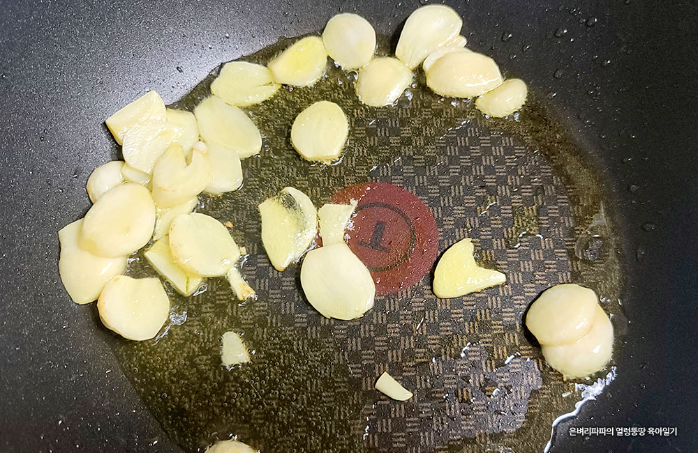 마늘은 얇게 편으로 썰어 준비해서 올리브유를 두른 볶음팬에 마늘 먼저 넣어 볶아주세요.