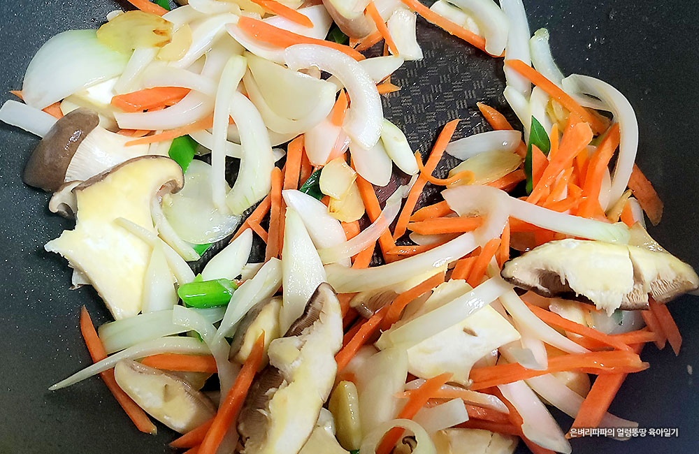 양파, 당근, 버섯, 대파를 먼저 넣어 볶다가