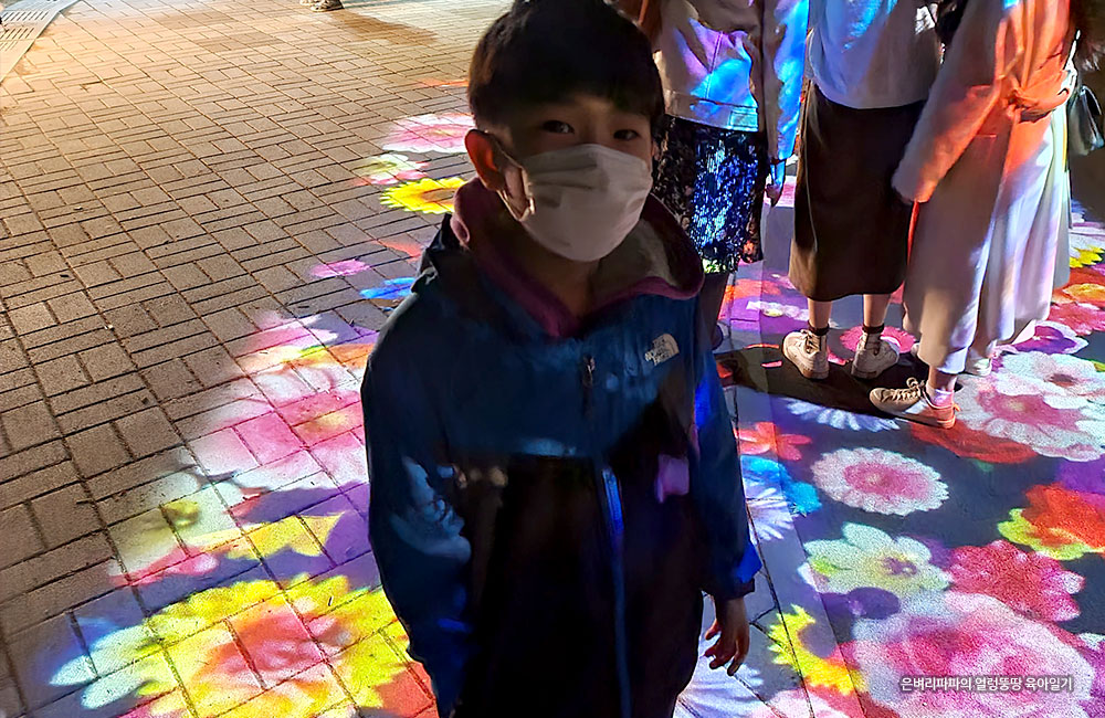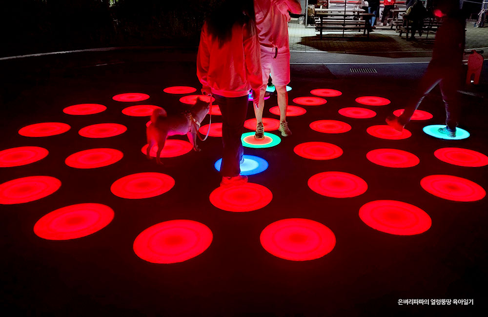 사람의 발길에 반응하는 바닥 조명과, 놀이터의 놀이기구가 영롱하게 조명으로 빛나고 있었어요.
