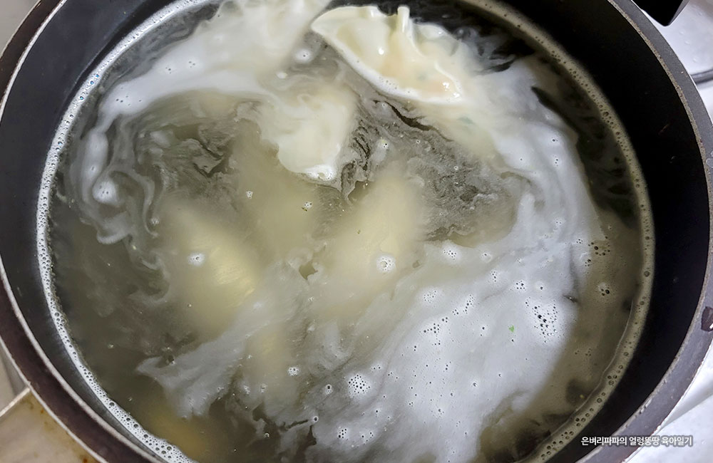 그대로 다시 끓기 시작하면, 냉동만두를 먼저 넣어 주세요.