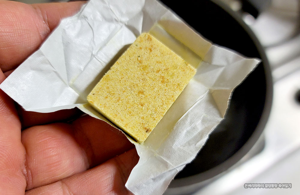 물이 끓기 시작하면 치키 스톡 하나를 넣어 줍니다.