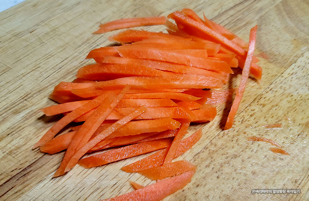 당근은 채 썰어 준비하고, 대파는 어슷 썰어 준비합니다.