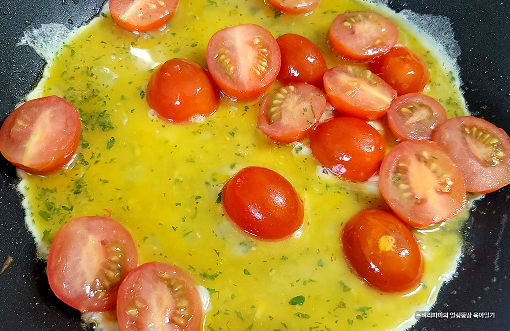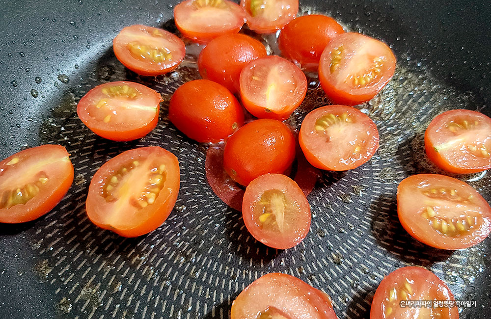 잘라놓은 방울토마토를 넣어 볶아주세요.