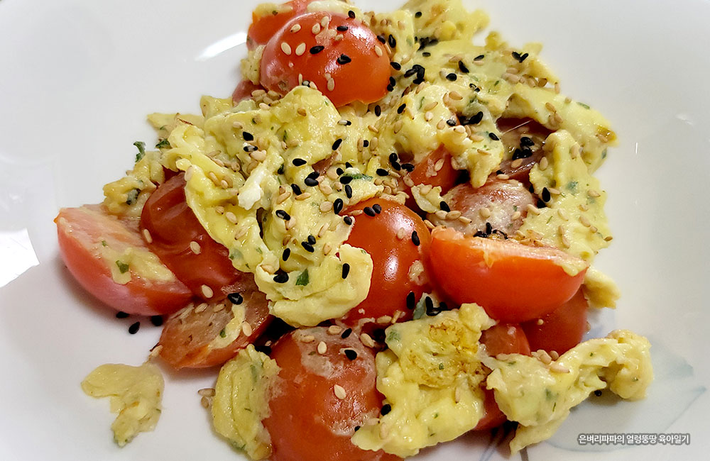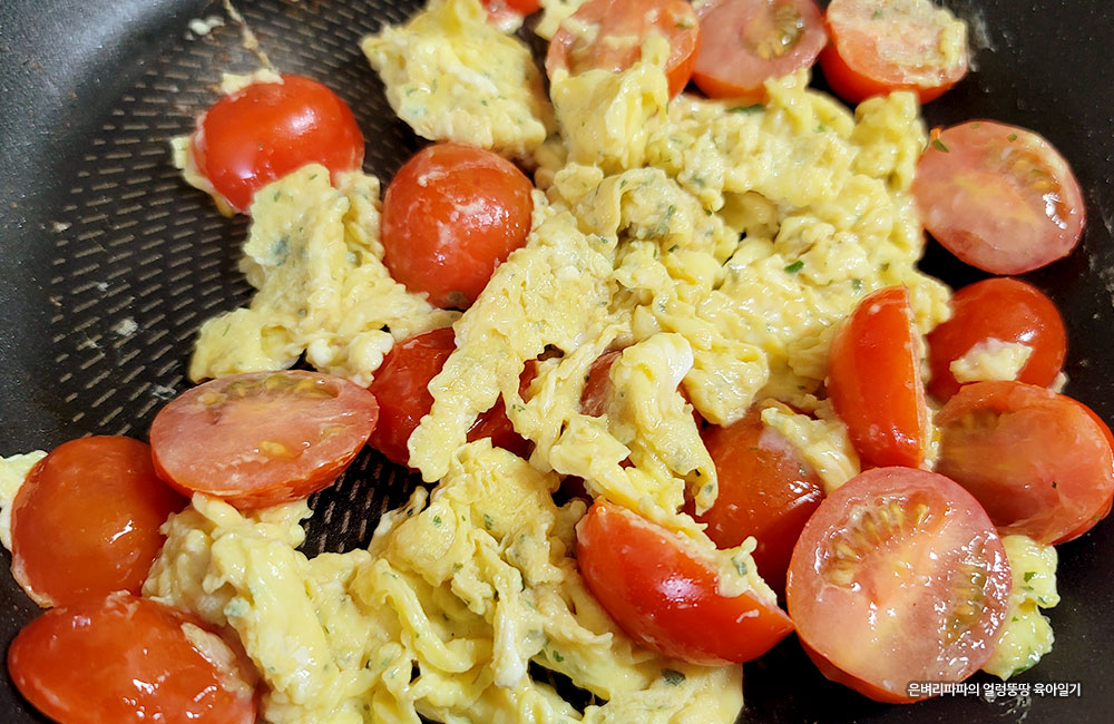 남은 계란물을 마저 넣고 방울토마토와 볶아 그릇에 담아내면 토달볶음 완성입니다.