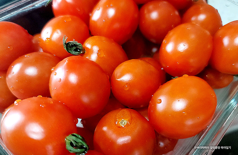 방울토마토는 깨끗하게 씻어 반으로 잘라 준비합니다.