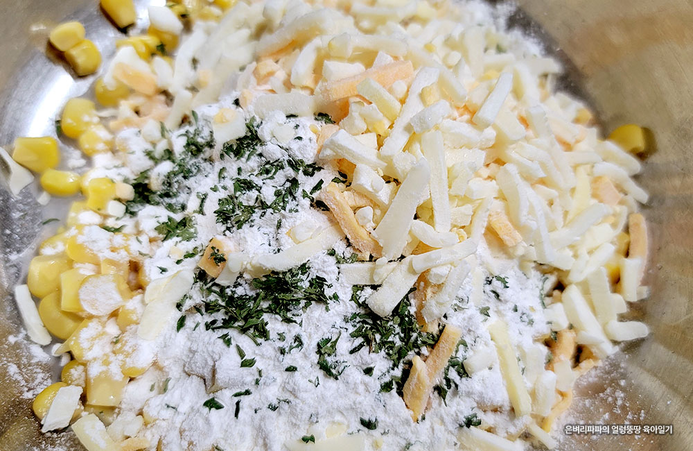 큰 그릇에 옥수수와 부침가루, 파슬리가루, 치즈를 한 번에 넣고 잘 반죽해 줍니다.