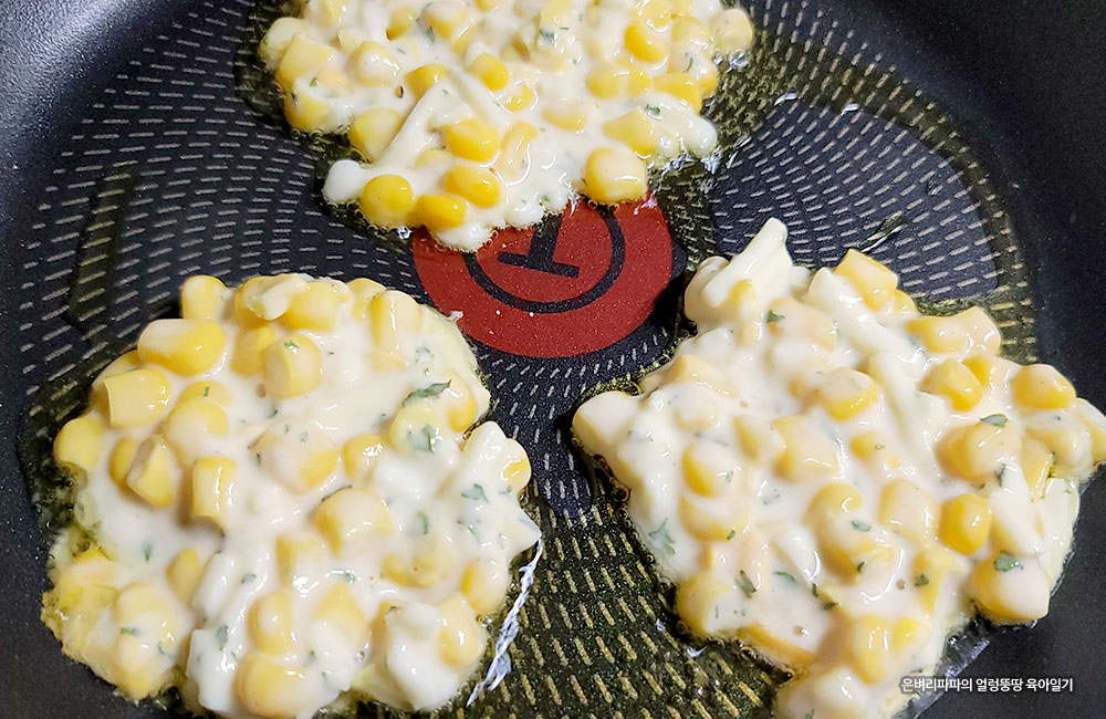 옥수수 반죽을 적당한 크기로 올려 노릇노릇 구워줍니다.