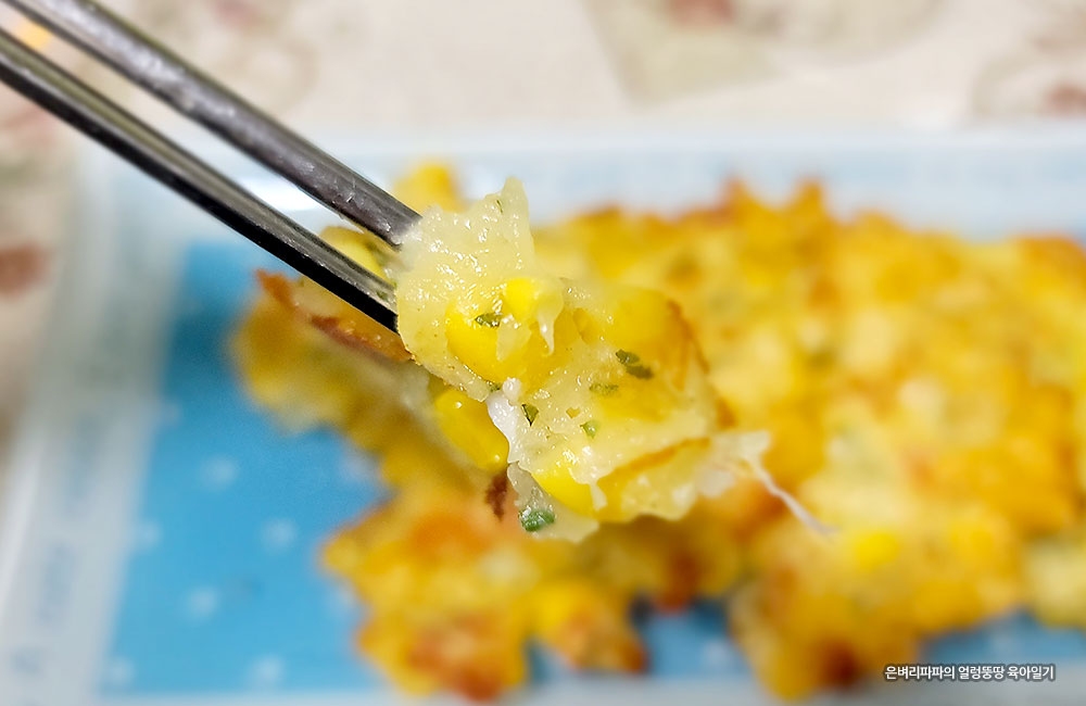 부침가루가 익으면서 옥수수 알갱이가 흩어지지 않아요.