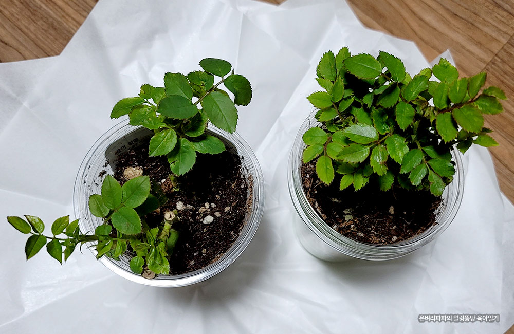 두 개 중, 하나의 장미잎이 축축 늘어져 있는 게 과습인 것 같아