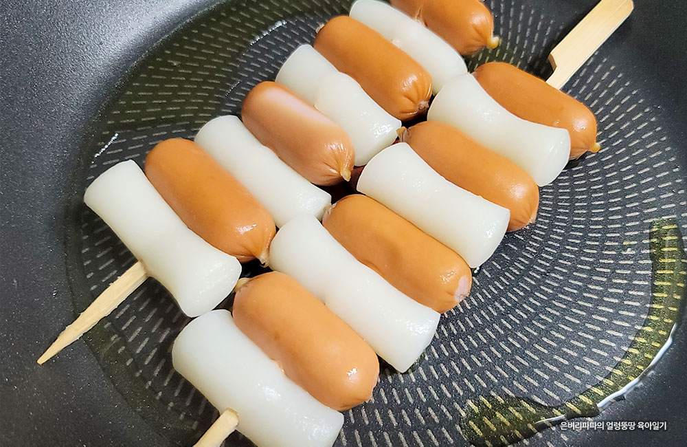 소시지와 떡을 차례로 꼬지에 끼웁니다.