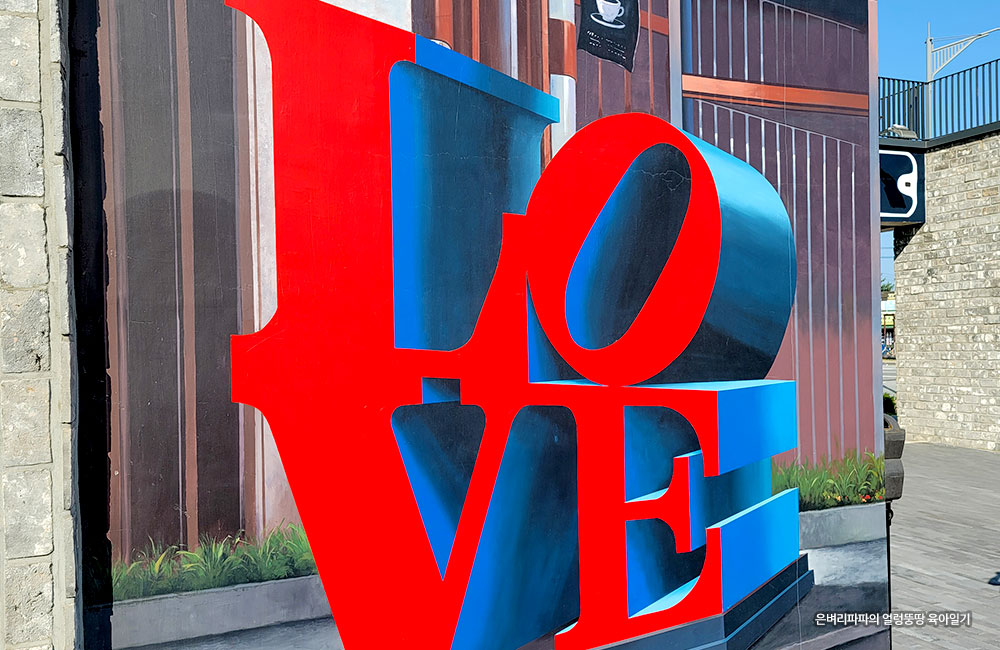 LOVE라는 글자가 형상화되어 있는 시멘트 벽이 보입니다.