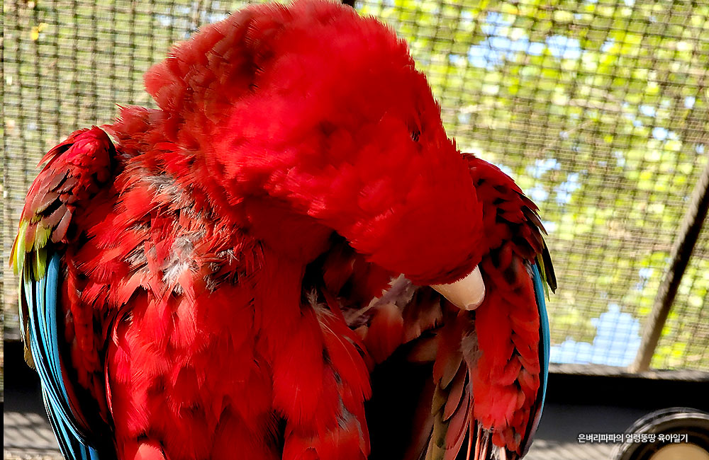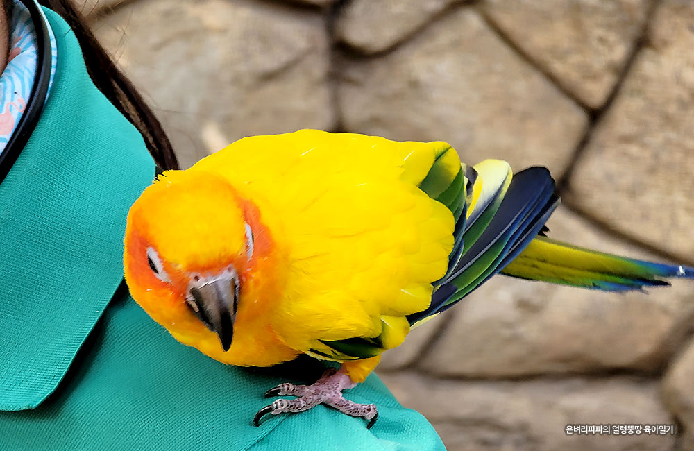 마지막에는 사육사 어깨 위에 앉아 조용히 쉬고 있는 앵무가 눈에 띄었어요.