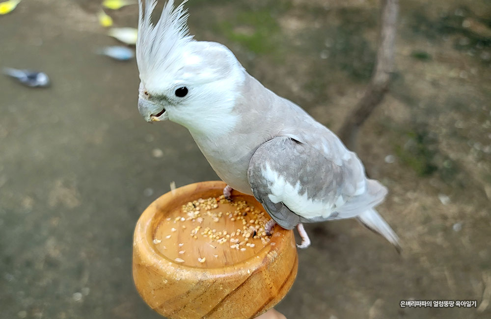 모이통에 구입한 먹이를 조금 부어 손을 뻗으면,