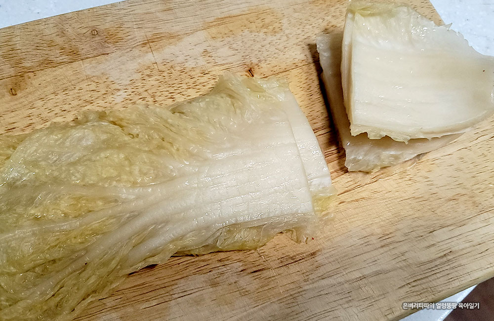 빨간 양념을 씻어낸 김치는 어느 정도 길이가 있는 것들만 골라 사용했어요.
