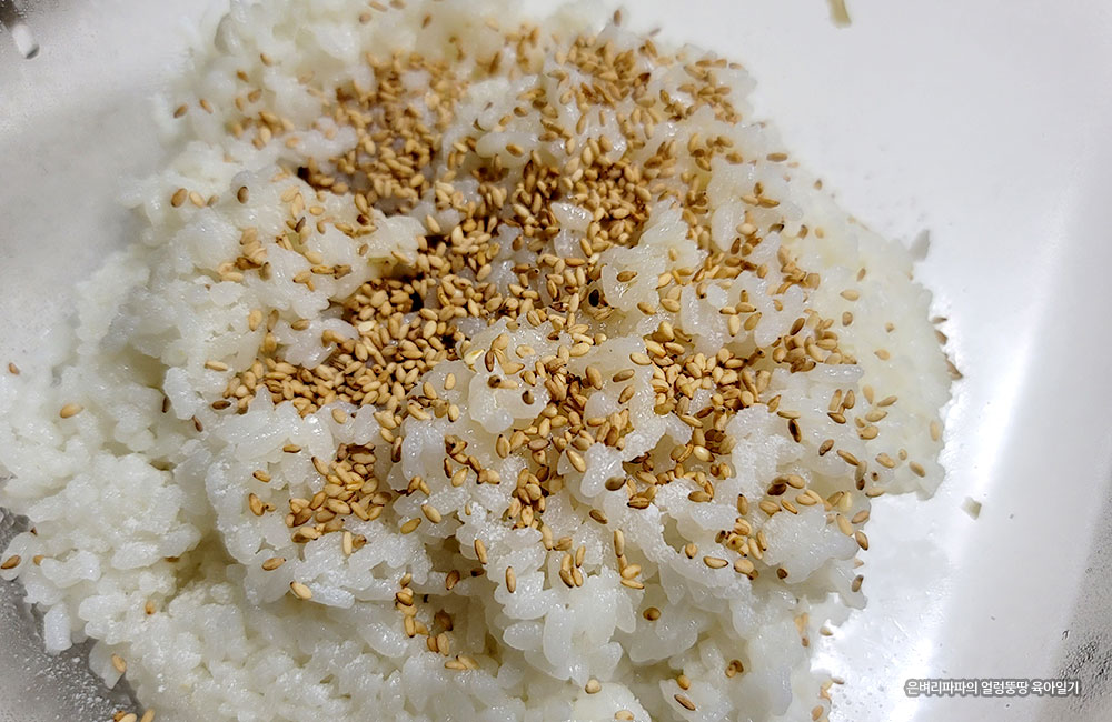 마지막으로 참깨를 듬뿍 넣어 잘 섞어줍니다.