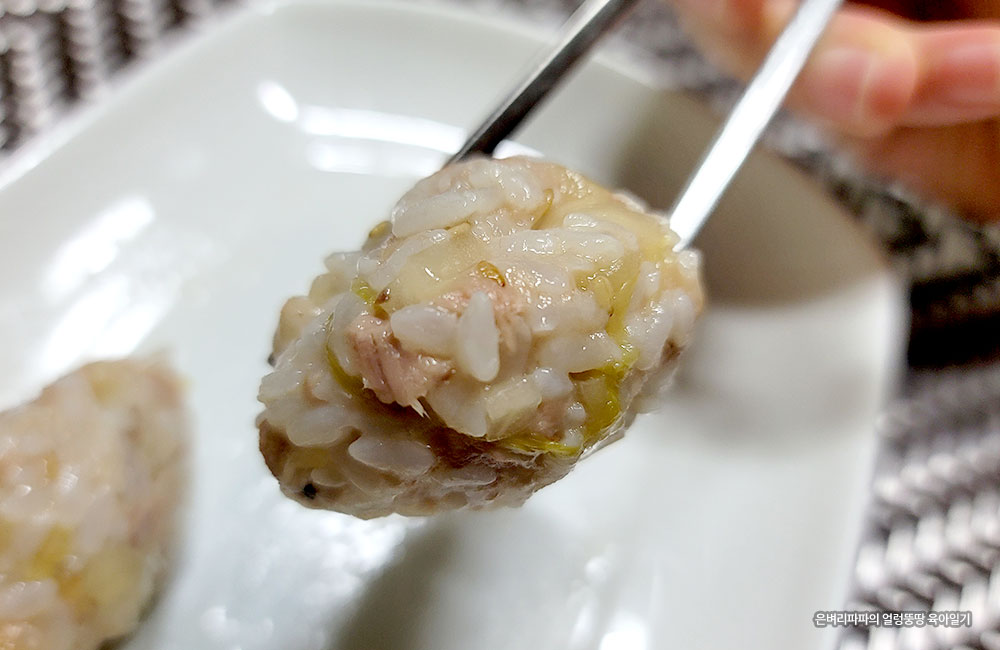 빨간 양념을 씻어낸 묵은지 참치 쌈밥입니다.