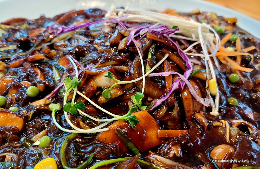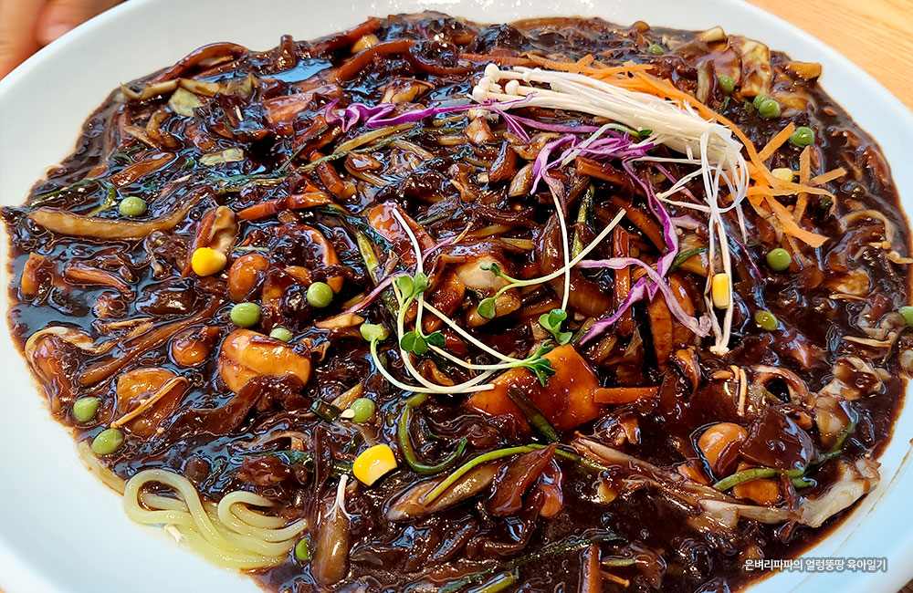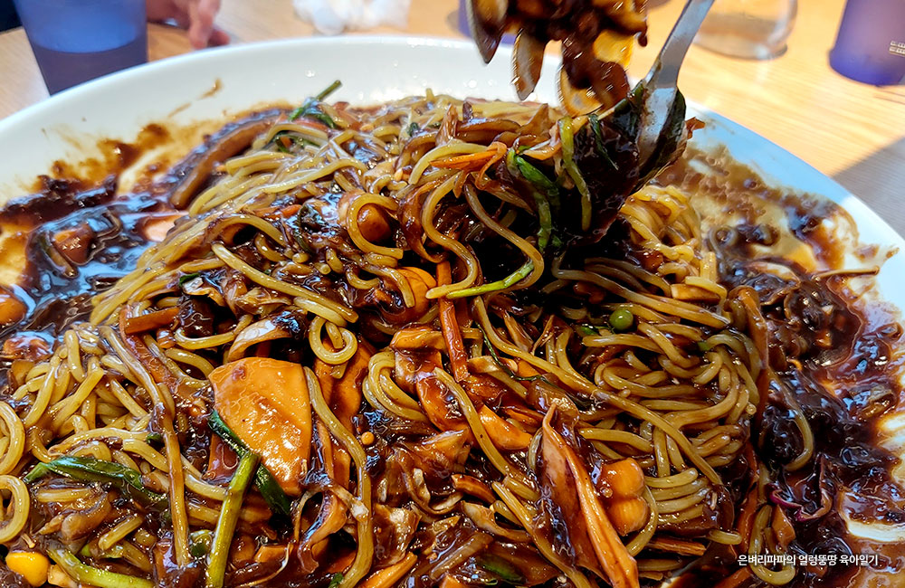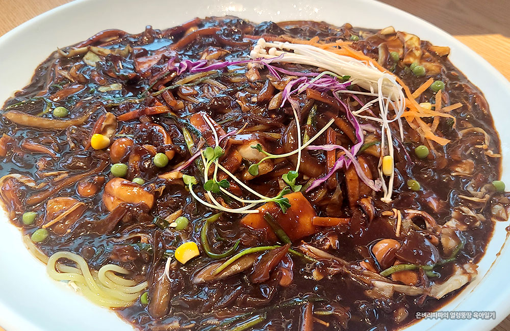 큼지막한 대형 접시에 수북이 쌓여 나오는 해물 쟁반짜장~