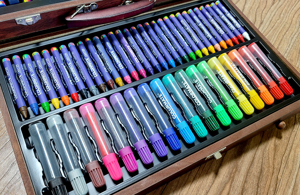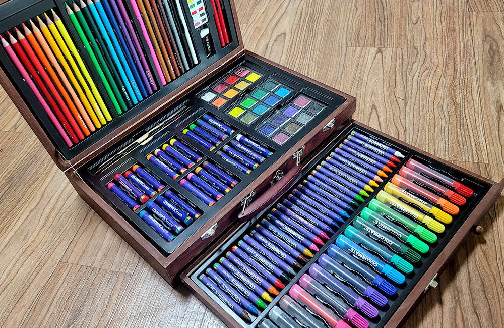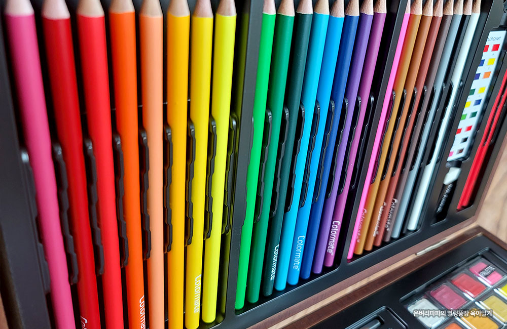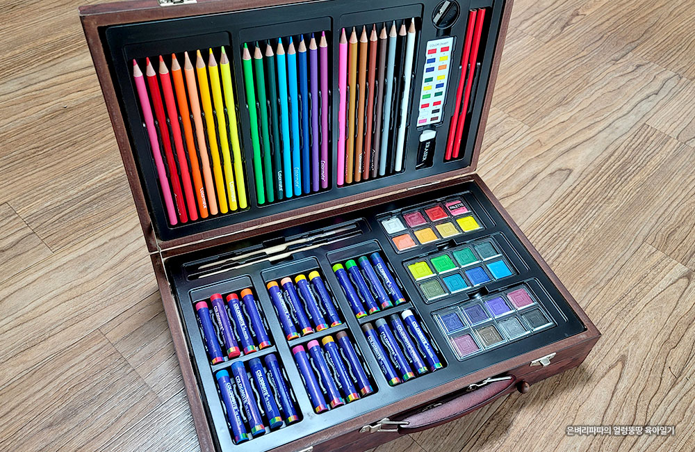 우드케이스 안에는 형형색색의 색채 도구들이 가지런히 정리되어 있습니다.