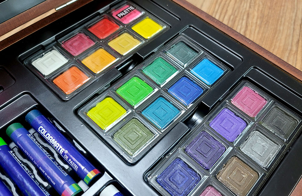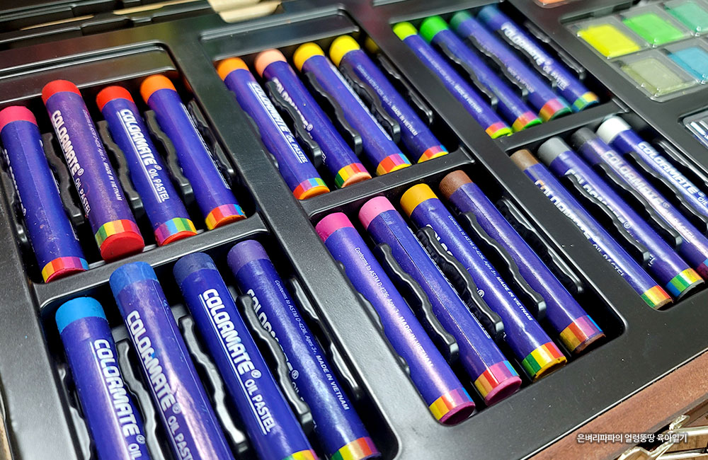 하단에는 오일파스텔과 고체 수채화 물감이 위치해 있습니다.