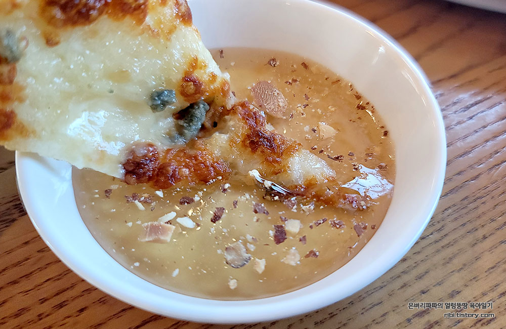 피자의 도우는 기름기가 적어 아주 담백했습니다.