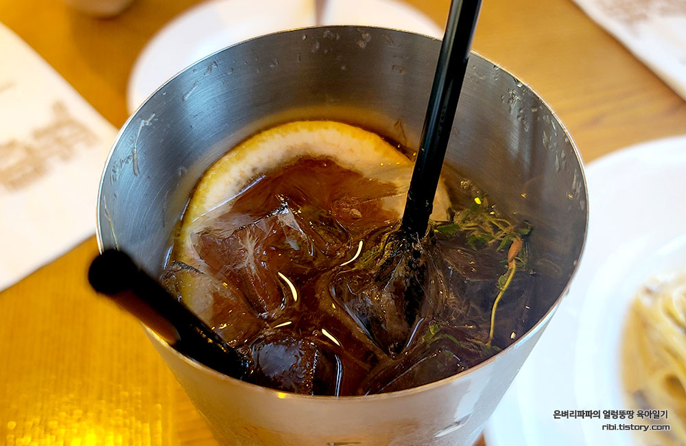 시원한 아이스티를 구매해서 그늘아래 벤치에 앉아 더위를 달랬습니다.