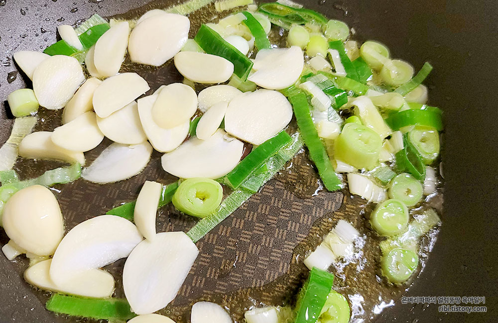파 기름에, 편 마늘, 양파를 볶던 볶음팬에