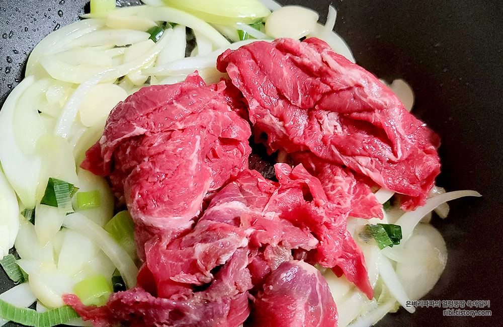 부챗살을 넣고 조금 볶다가, 고기가 익어가는 것이 눈에 보이면 소스를 부어줍니다.