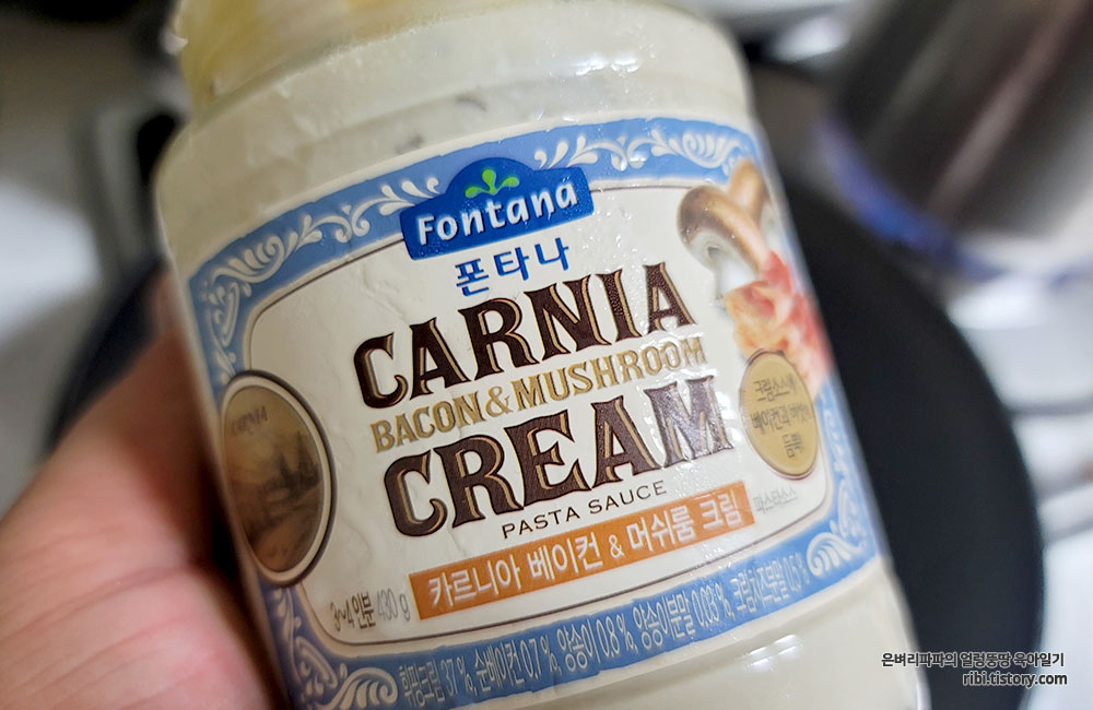 계속 냉장고에 보관되어 있던 크림소스로 까르보나라 스파게티를 만들었습니다.