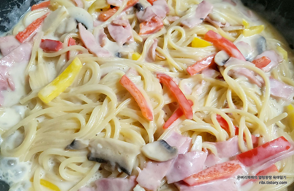 재료 : 시판용 크림소스, 스파게티면, 마늘, 파프리카, 양송이버섯, 베이컨, 올리브유