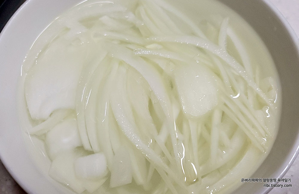 양파는 매운맛을 제거하기 위해 찬물에 담가둡니다.