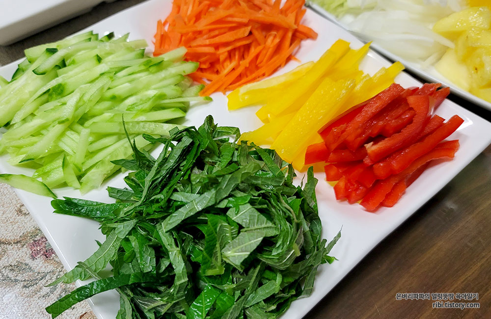 집에 있는 각종 채소를 채 썰어 준비하고,